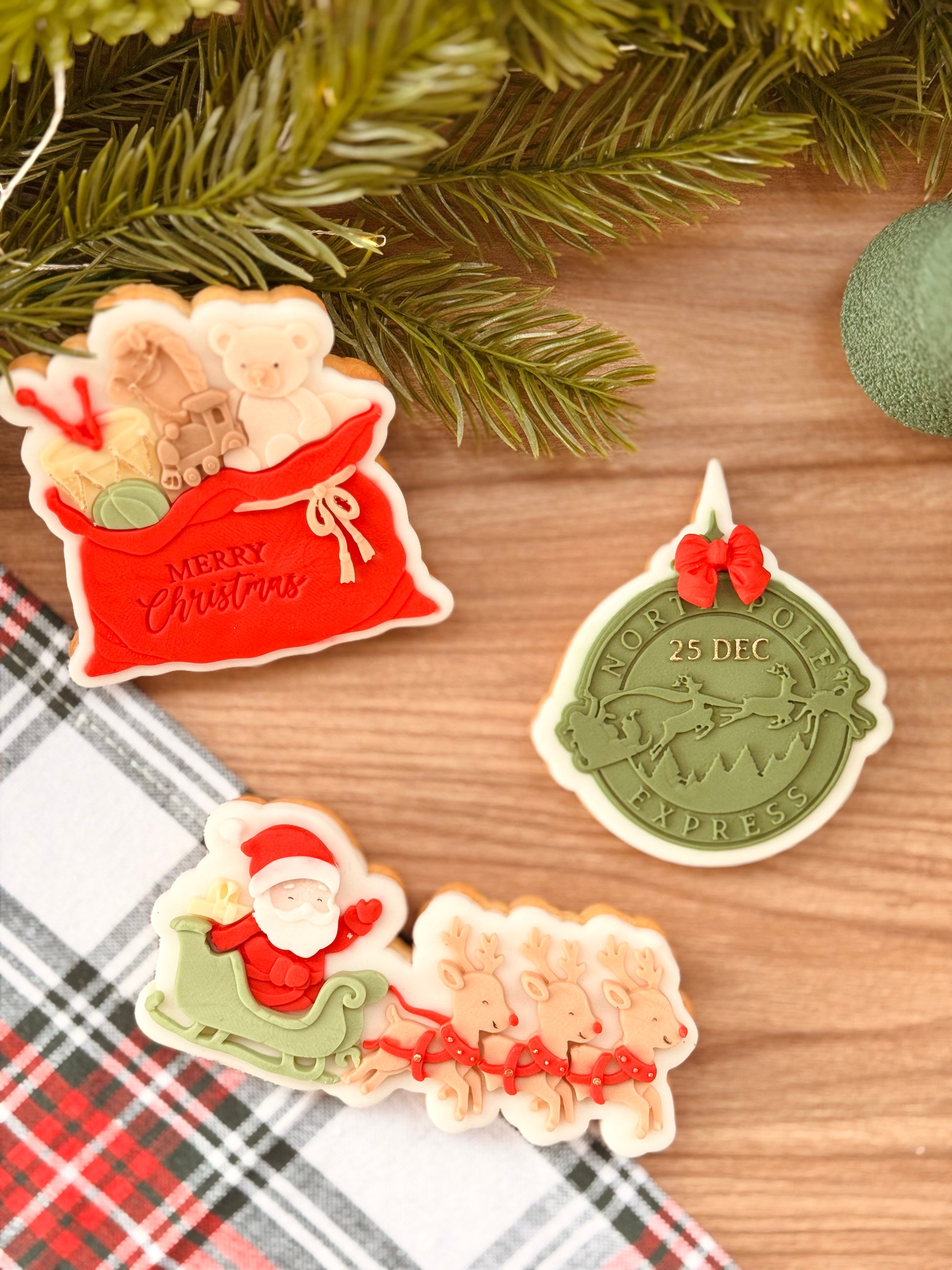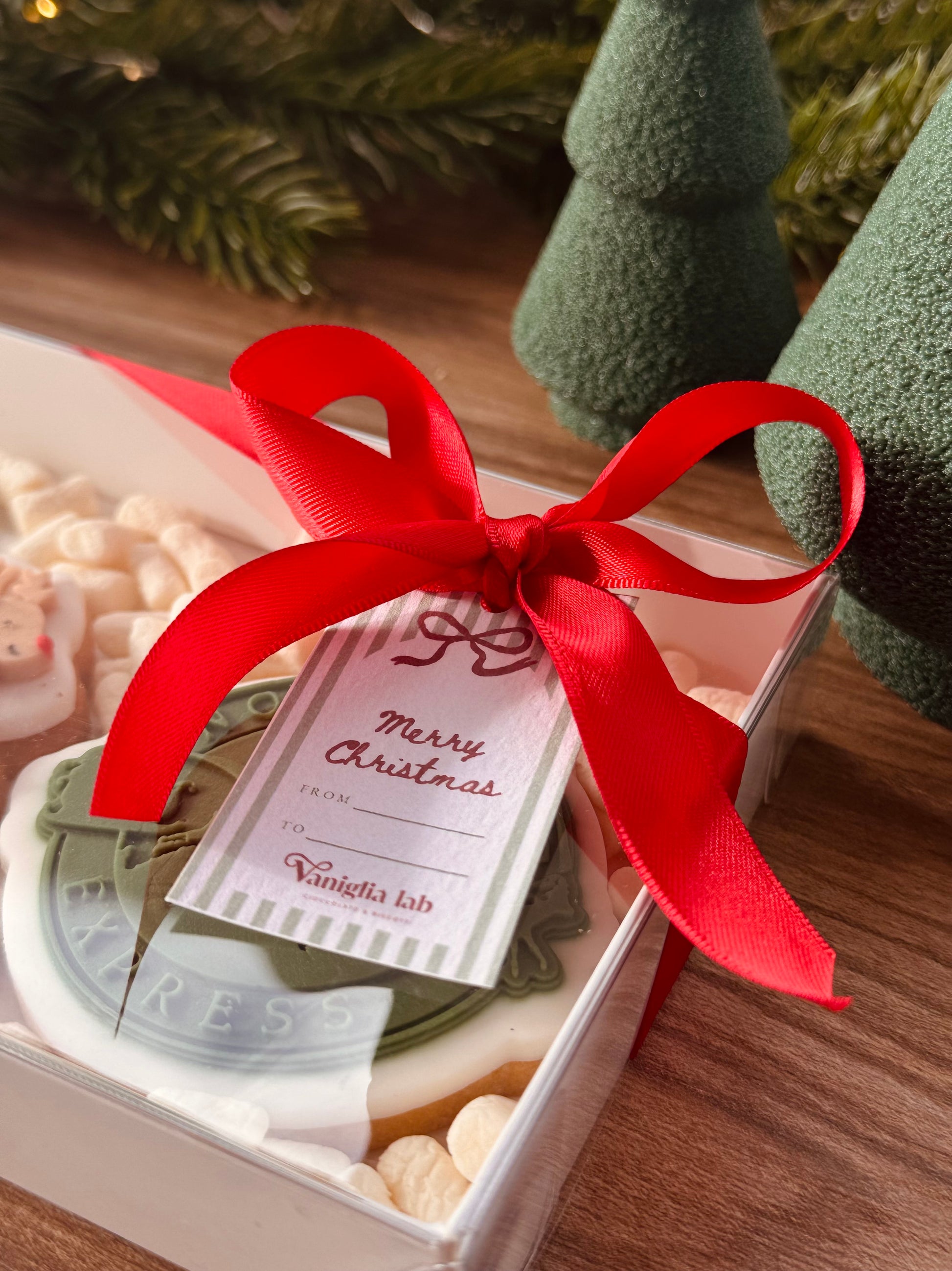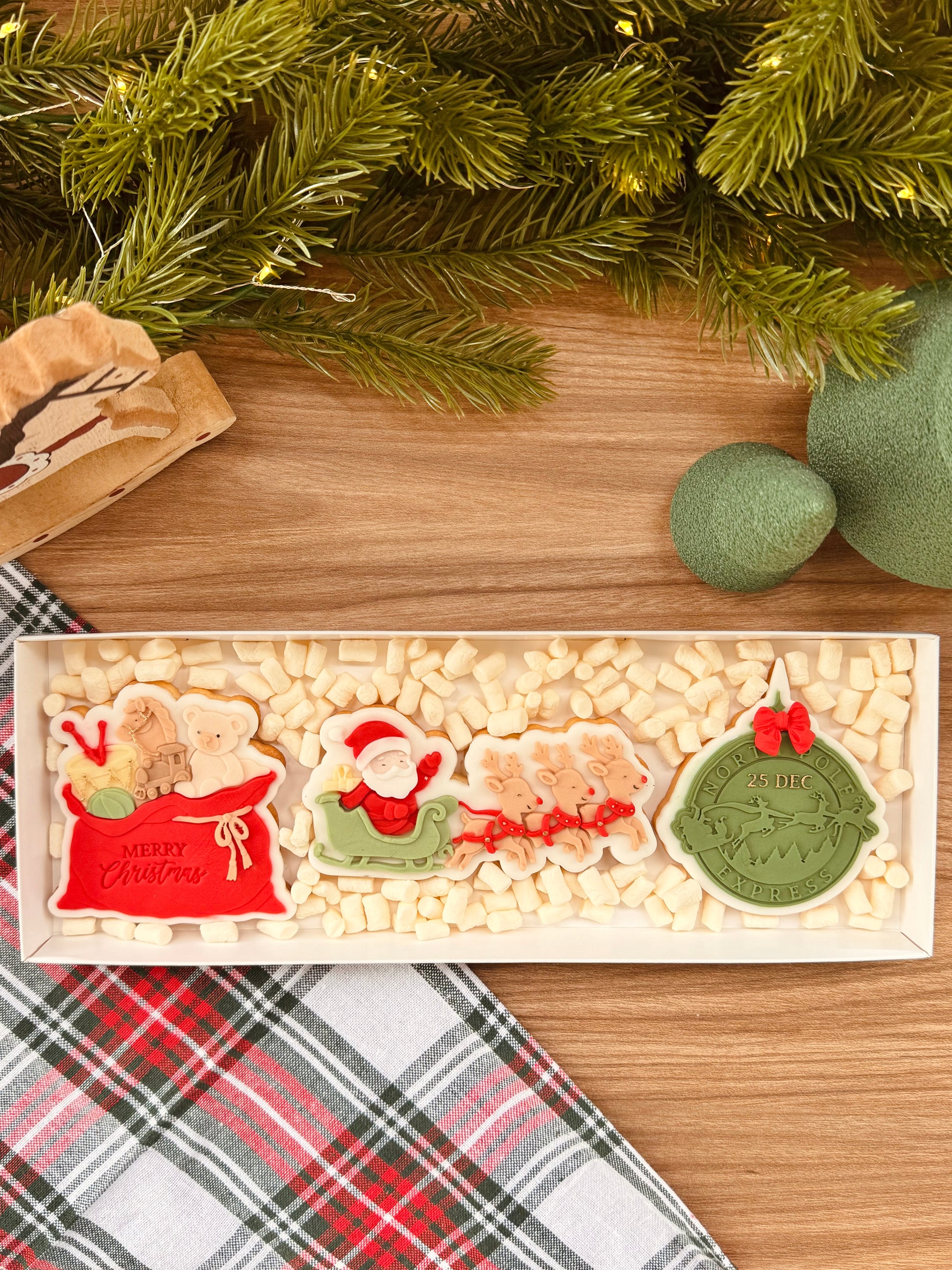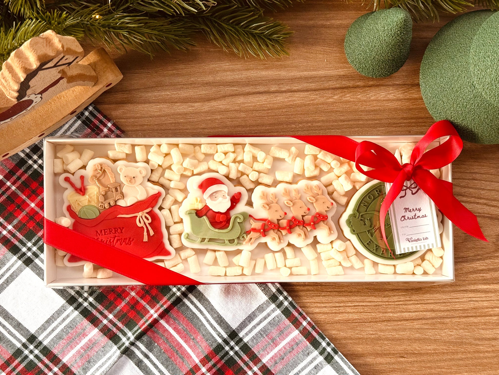 Un’elegante gift box piena di magia: biscotti artigianali decorati a mano, con Babbo Natale sulla slitta, renne, sigillo “North Pole Express” e sacco pieno di giocattoli.