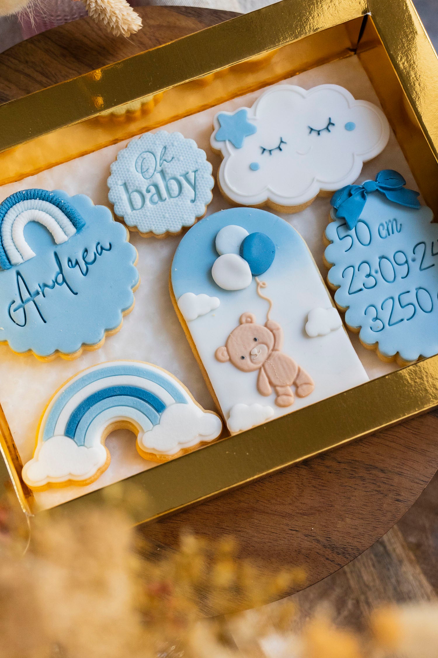 Un grazioso set di biscotti, racchiusi in una raffinata scatola, che si presta molto bene come regalo nascita.