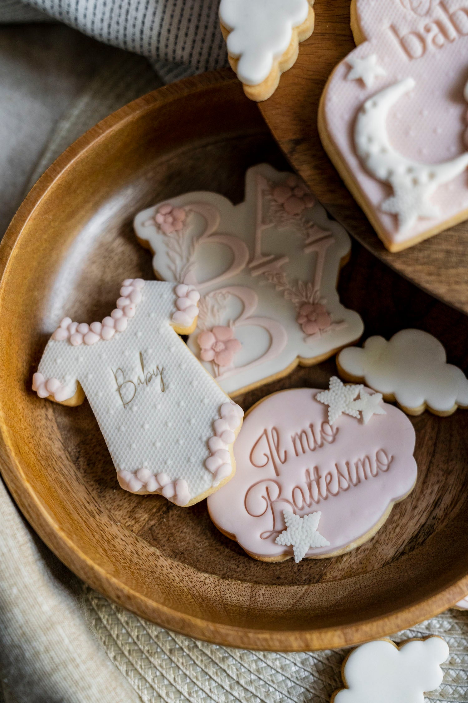 I biscotti in pasta di zucchero a tema battesimo sono dolcetti decorativi e raffinati, perfetti per celebrare questo momento speciale. Possono essere personalizzati in base ai colori e ai dettagli del battesimo, offrendo un tocco elegante alla festa,