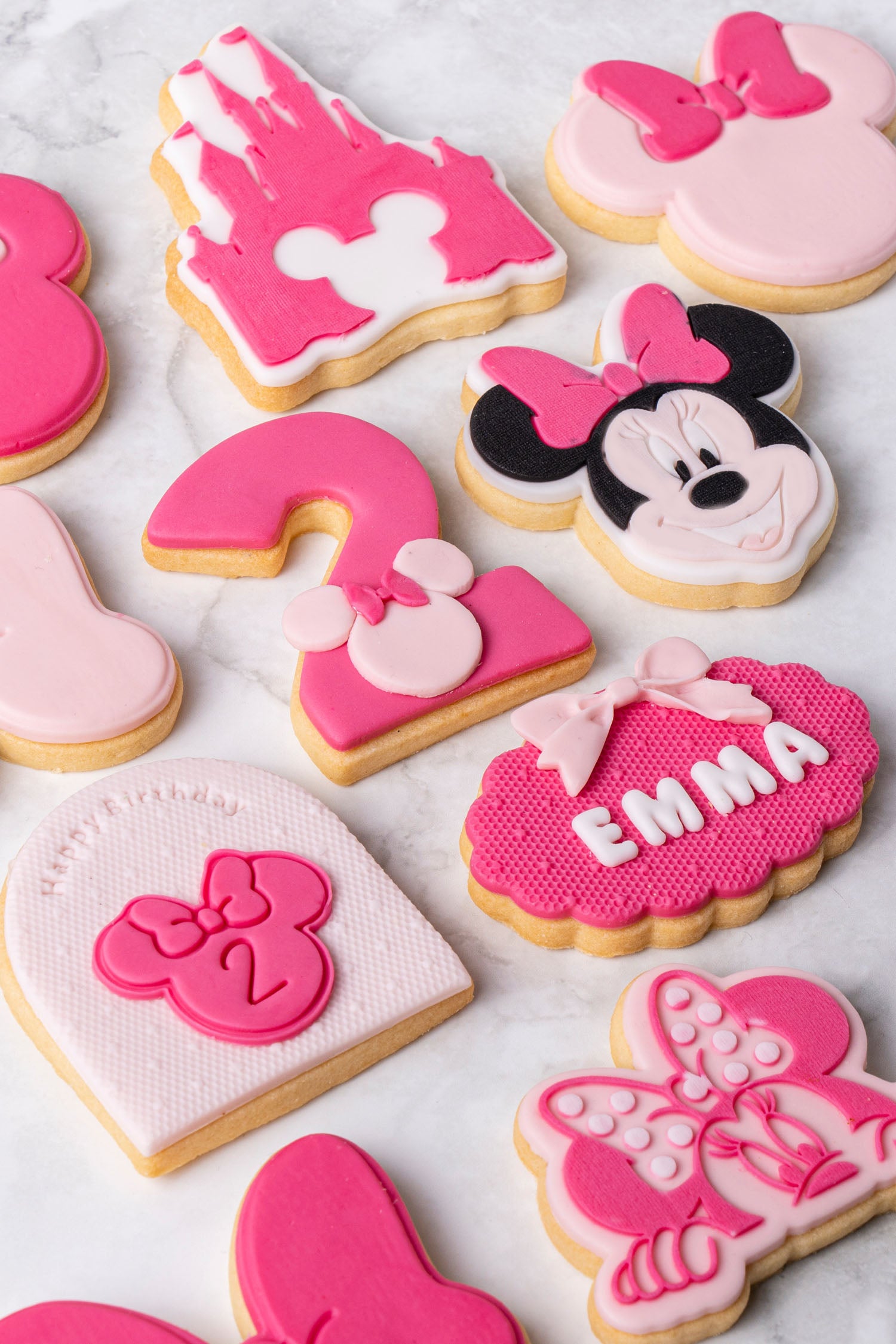 Grazioso set di biscotti a tema minnie, personalizzabile con il nome e anni della bimba.